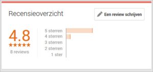 - Recensies worden ook steeds vaker in de zoekresultaten getoond. Dit zorgt ervoor dat je bedrijf (positief) opvalt tussen de zoekresultaten; zie onderstaand plaatje.